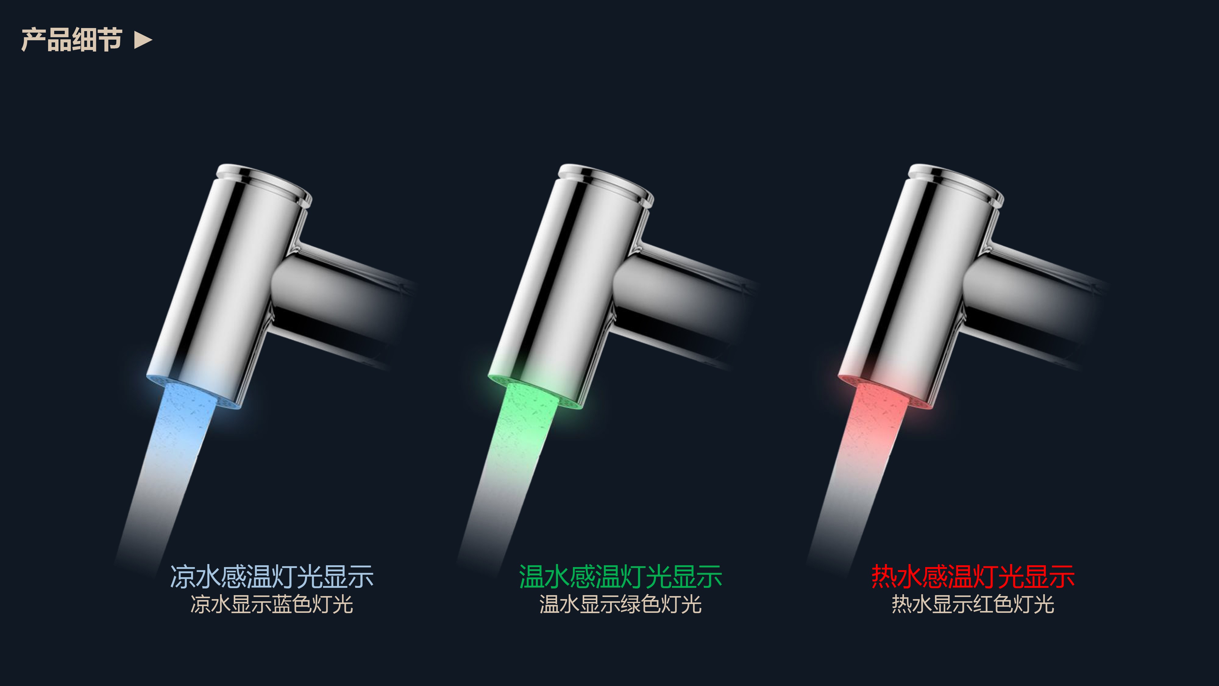 360°全方位抽拉清洗;微光龍頭,深夜使用不開大燈,不刺眼;日常洗頭利器,抽拉出水輕松洗;按壓切換兩功能水花;三種顏色LED燈光顯示水溫;重力錘復位設計,順暢伸縮,精準回位;無需工具,一推一擰10秒快裝